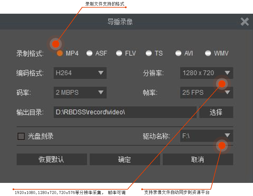 强大的直播推流能力,能同时做八路推流,支 持同时向斗鱼、微信云平台、百度云、优酷等多个主流平台推流;支持RTMP、RTSP、HLS、MMS协议,直播支持码率大小、分辨率大 小、帧率数值调整;